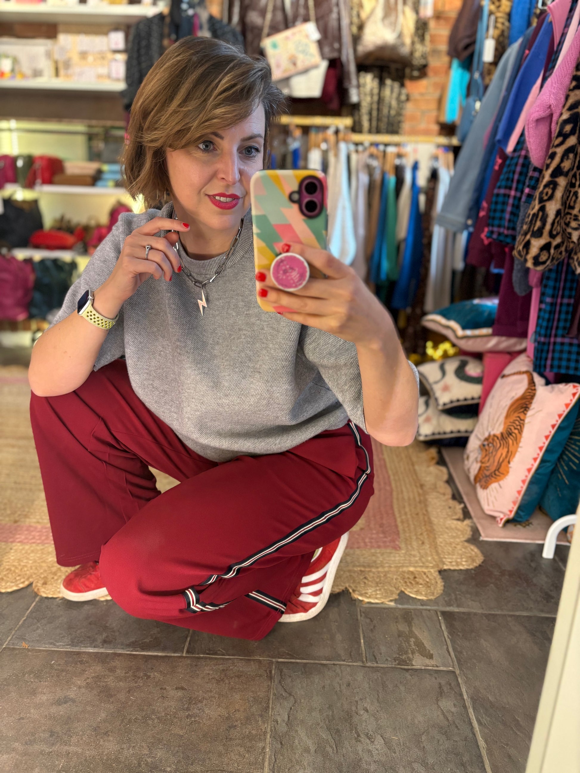Indulge in the colours of the season with our Berry Stripe Trousers. Featuring a rich burgundy hue with a sporty stripe detail, these trousers offer both style and comfort with their elasticated waist and loose fit. Pair with a luxurious knit and trainers for an effortlessly chic and casual look with a touch of sports luxe.