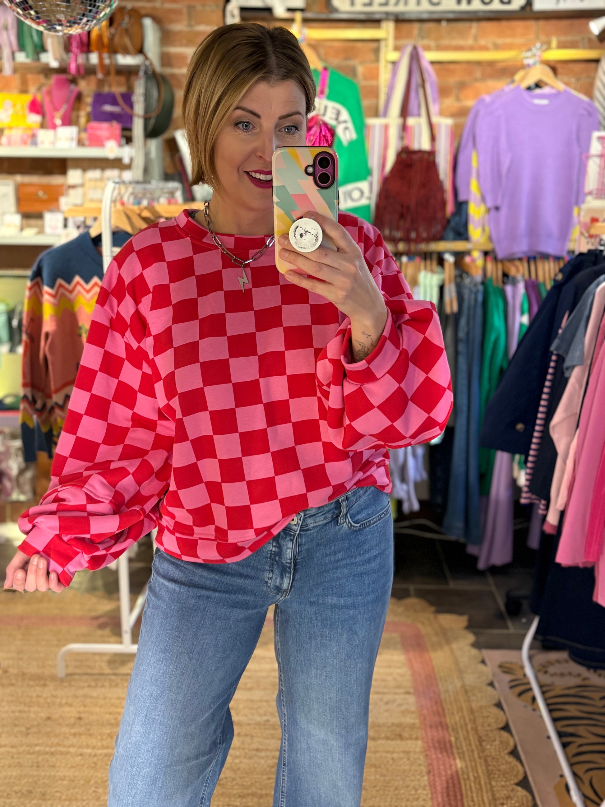 Throw on instant joy with this checkerboard sweatshirt that's equal parts cosy and quirky.