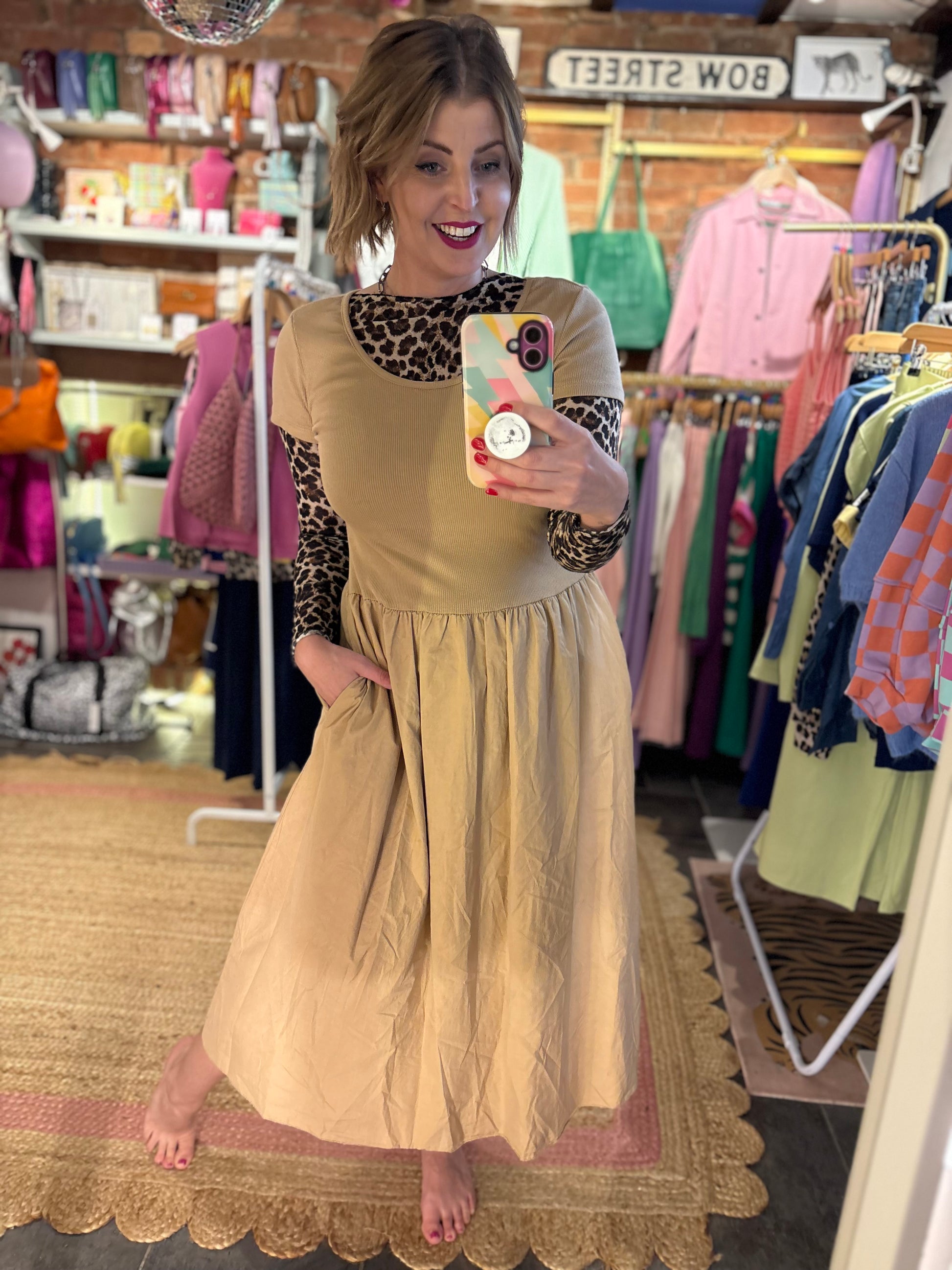 Crafted from super-soft fabric with a stretchy ribbed bodice, it features short sleeves and a flattering midi-length skirt-complete with practical pockets.