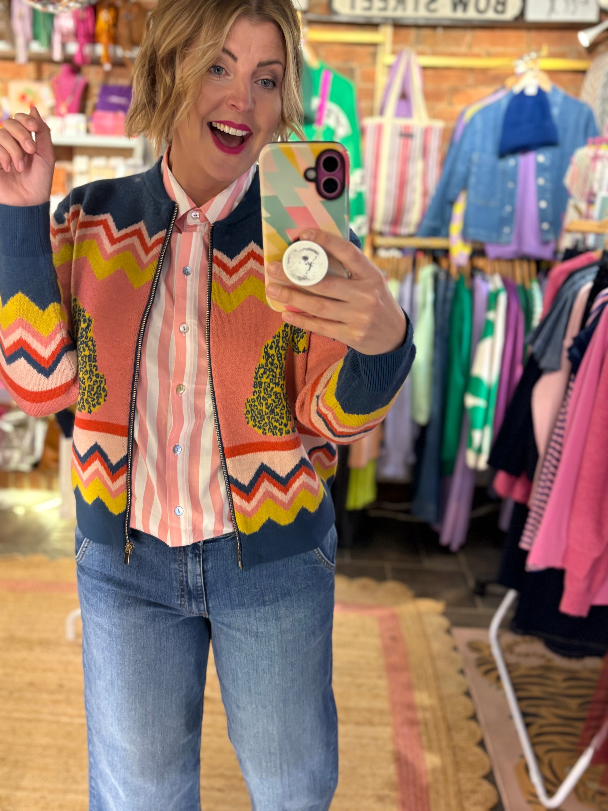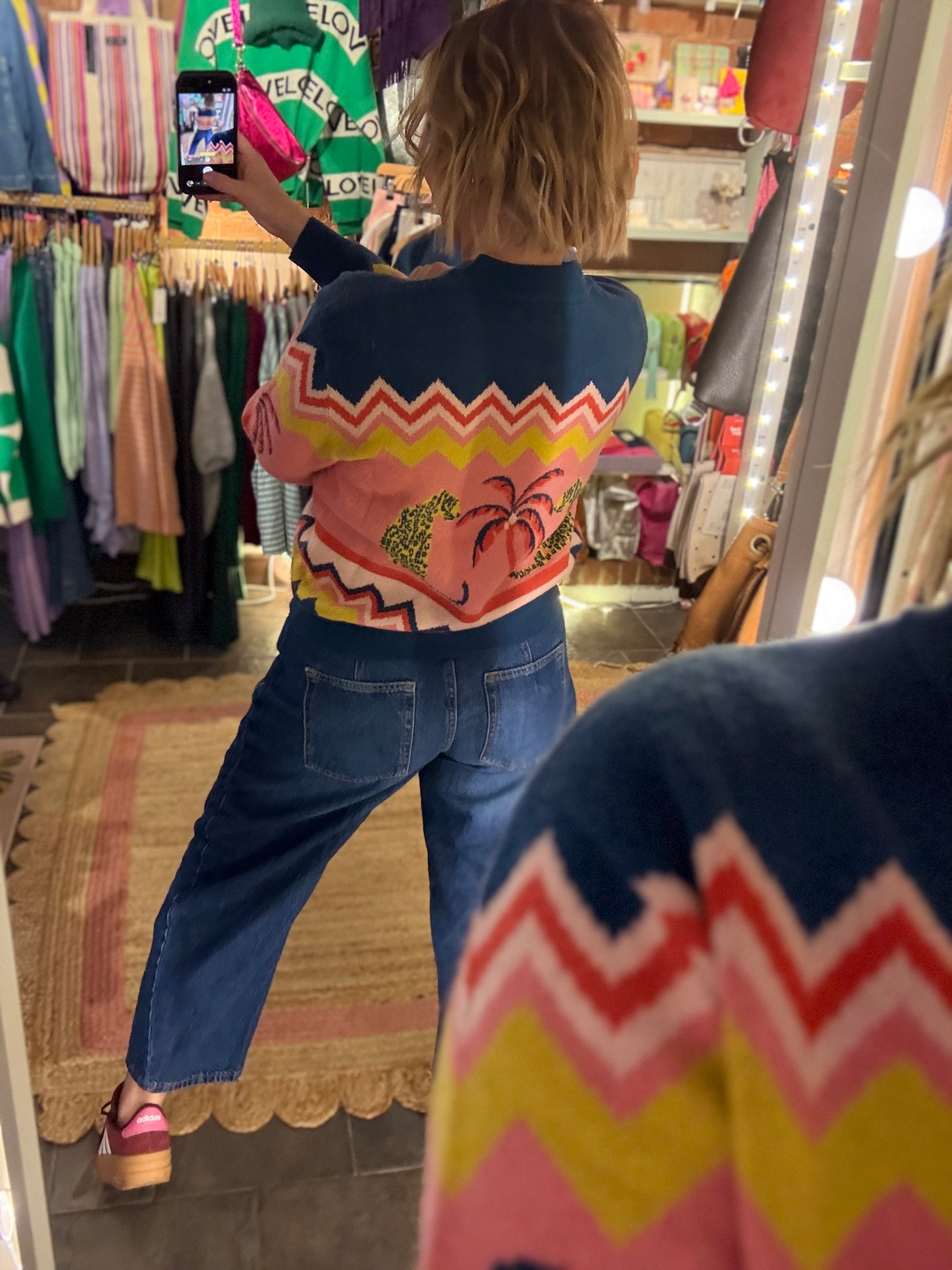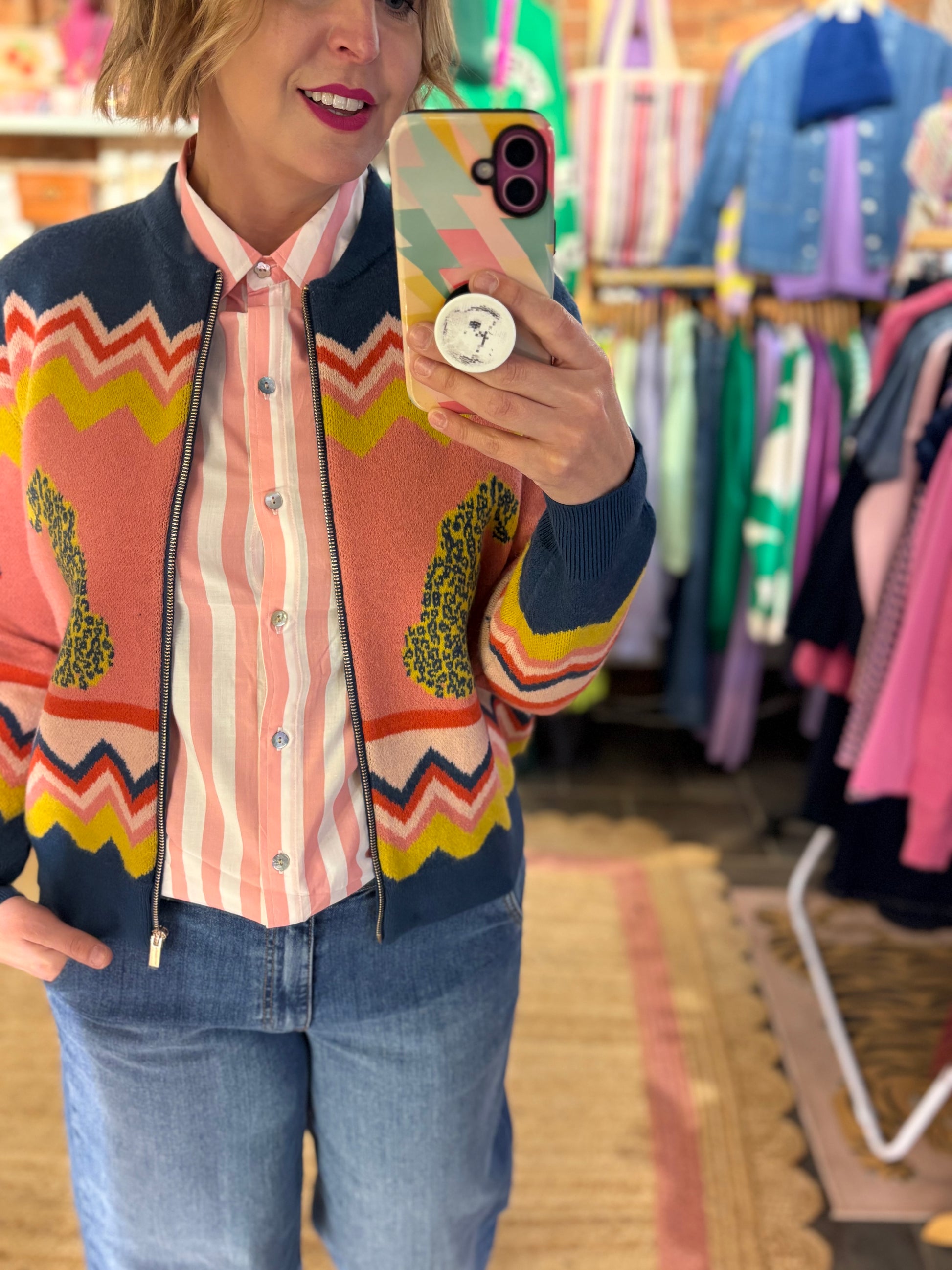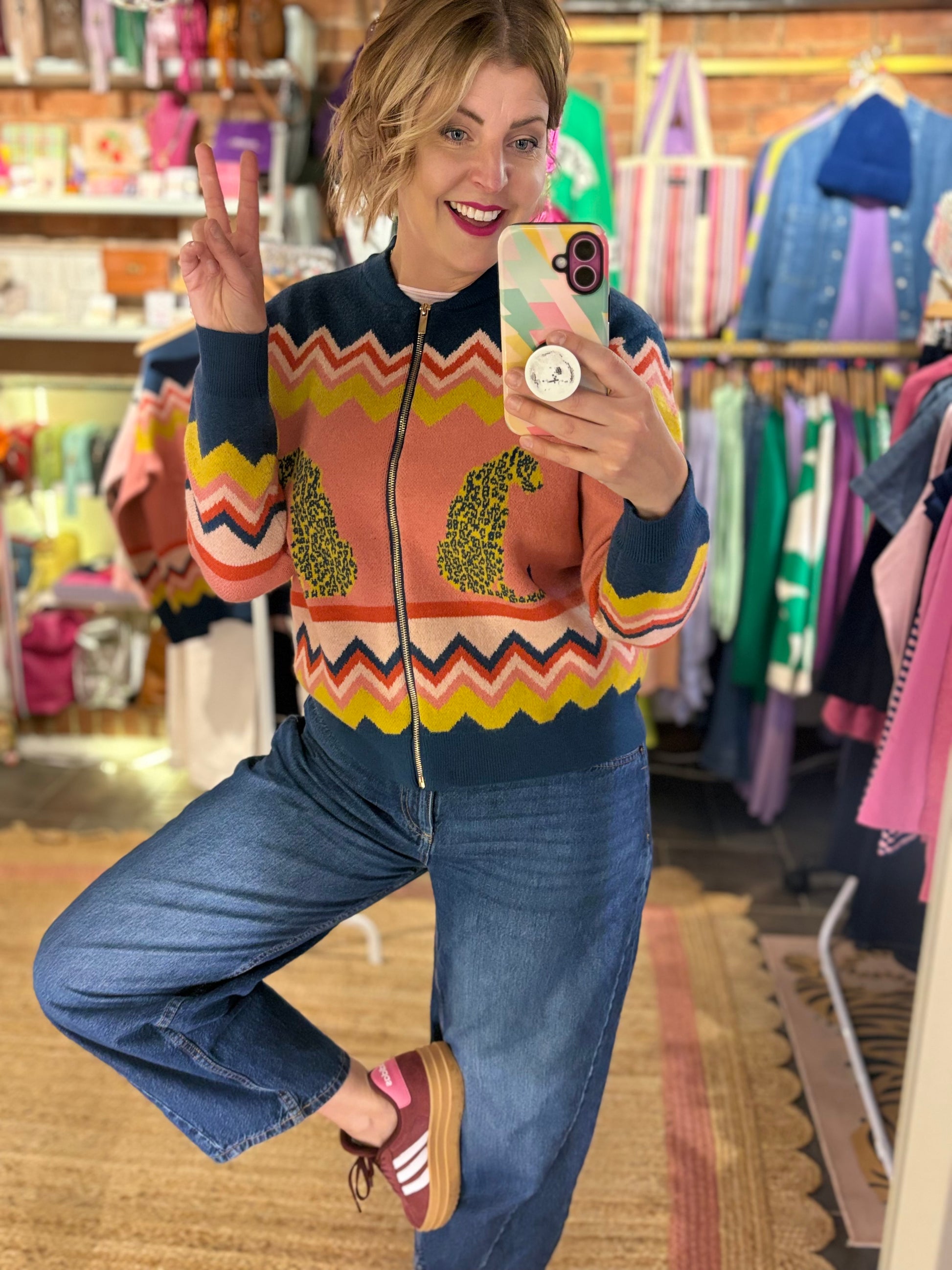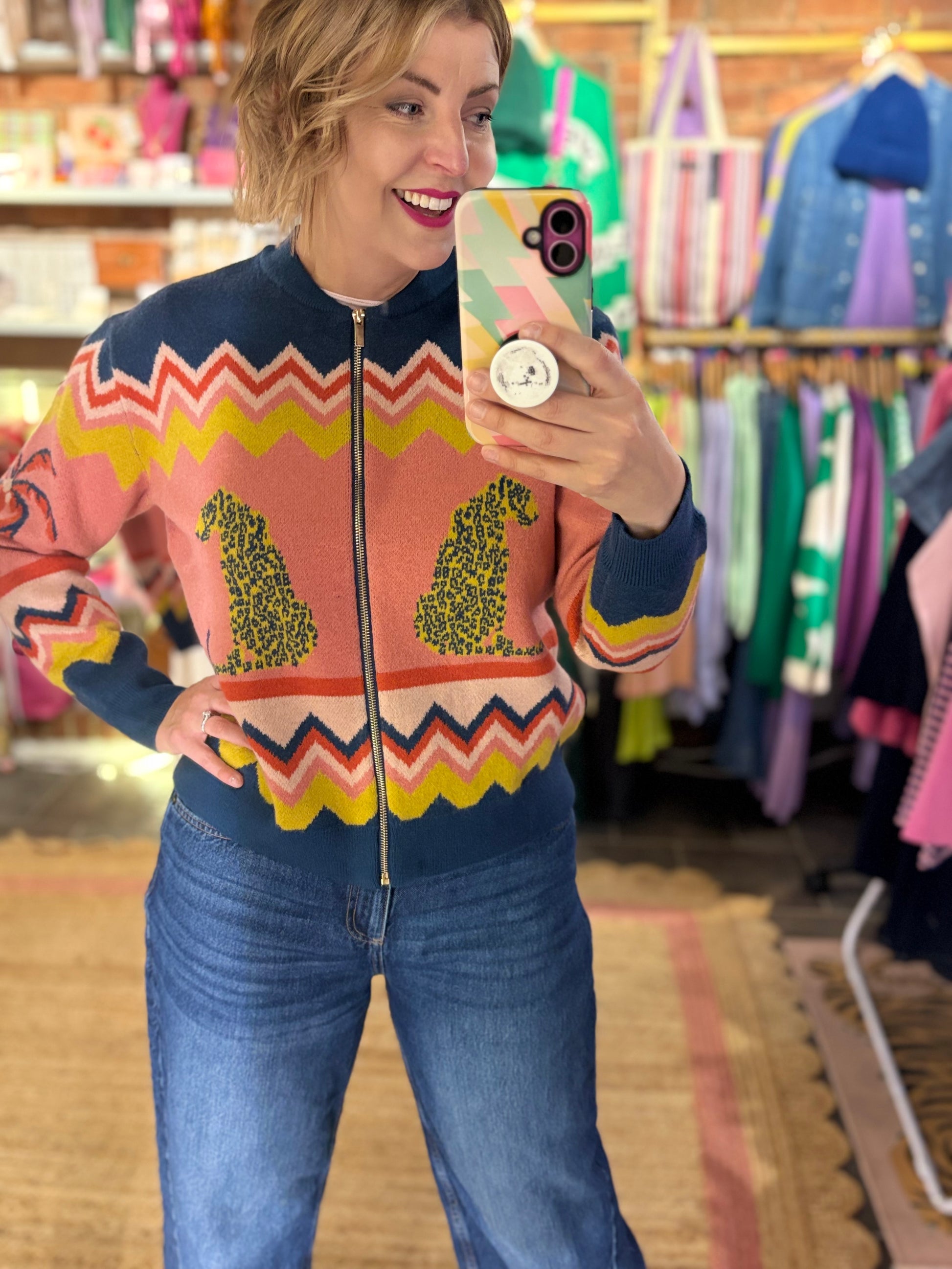 Elevate your weekend wardrobe with this distinctive knitted bomber cardigan, featuring an unexpected blend of Leopards, palm trees & chevron!