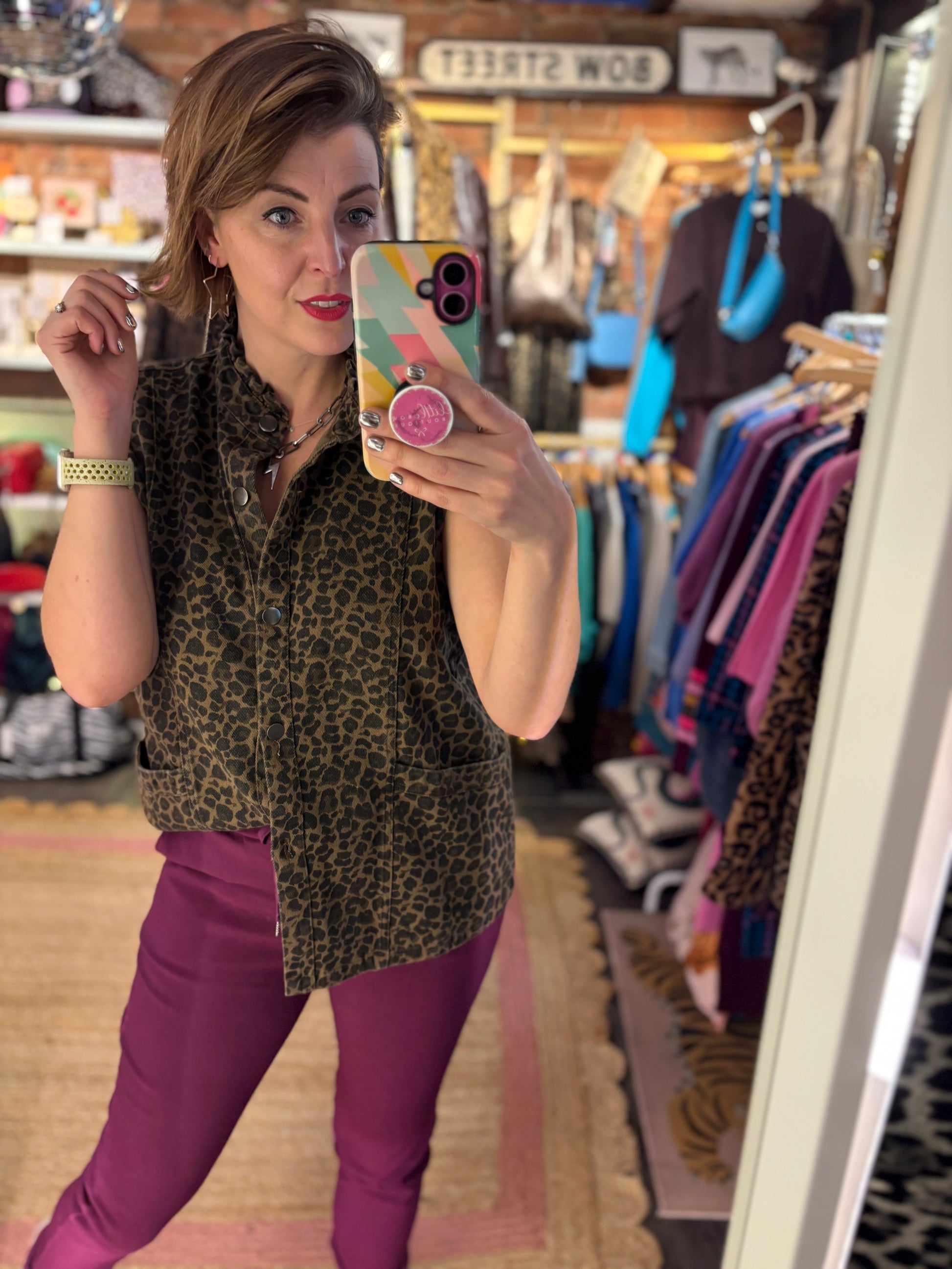 A sleeveless gilet, crafted in a leopard print denim fabric. This on-trend piece showcases a classic animal print pattern, button front and a ruffled collar. A seasonal essential, this piece is ideal for layering.