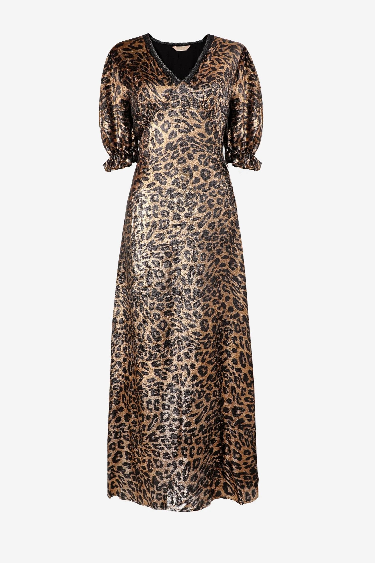 A classic leopard print midi tea dress crafted from lustrous metallic fabric. This classic piece features an elongated V-neck, short puff sleeves and a flattering high waist. An ideal occasion piece, this tea dress can be worn for parties, cocktails and special events.