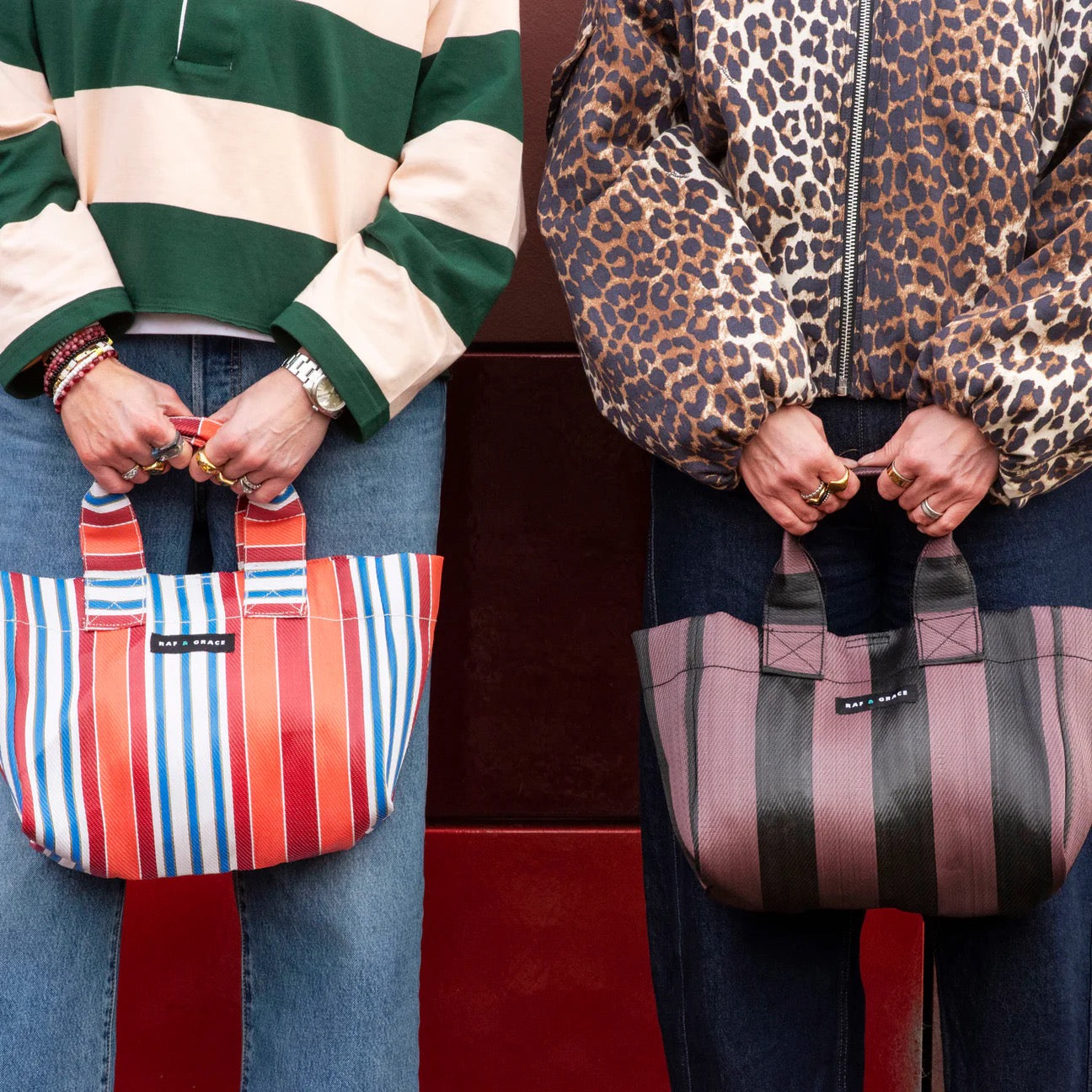 New in for Spring 26! Our latest addition to our accessories range. The new micro shopper! This Fig Brown and Black Striped micro shopper bag made from recycled plastic. We called it fig brown as it has purple tinge in certain light!