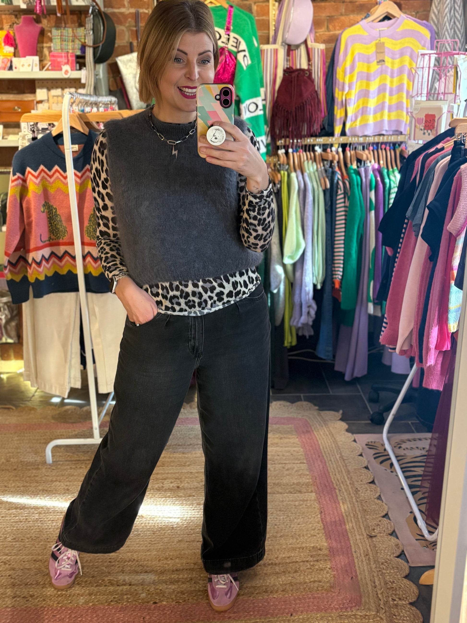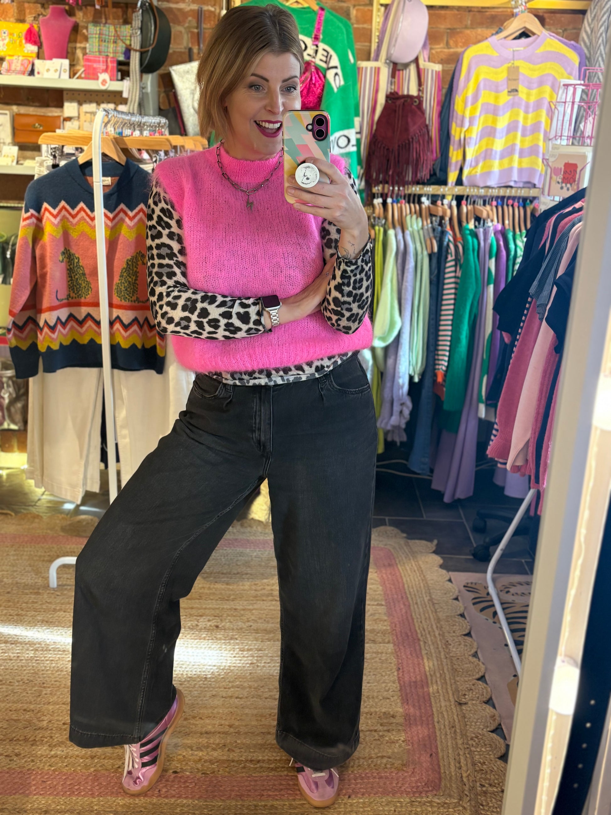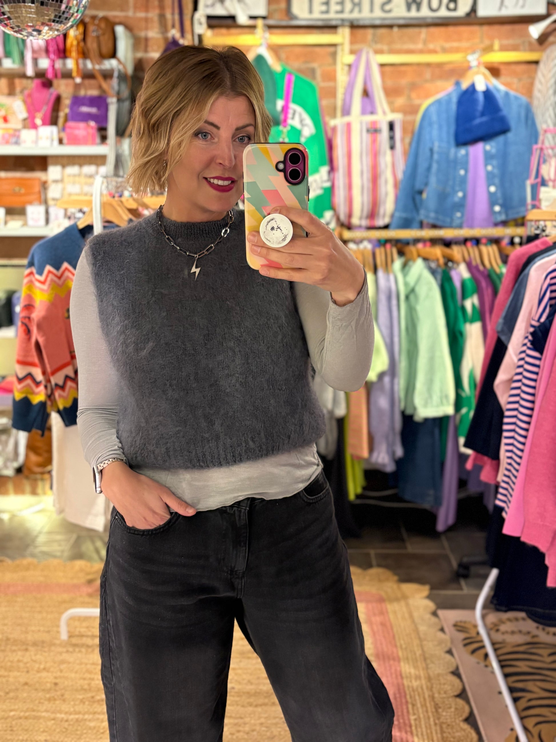 The slim, tailored fit flatters your frame while maintaining a playful edge—perfect for layering over basics or wearing solo for an effortlessly chic look.