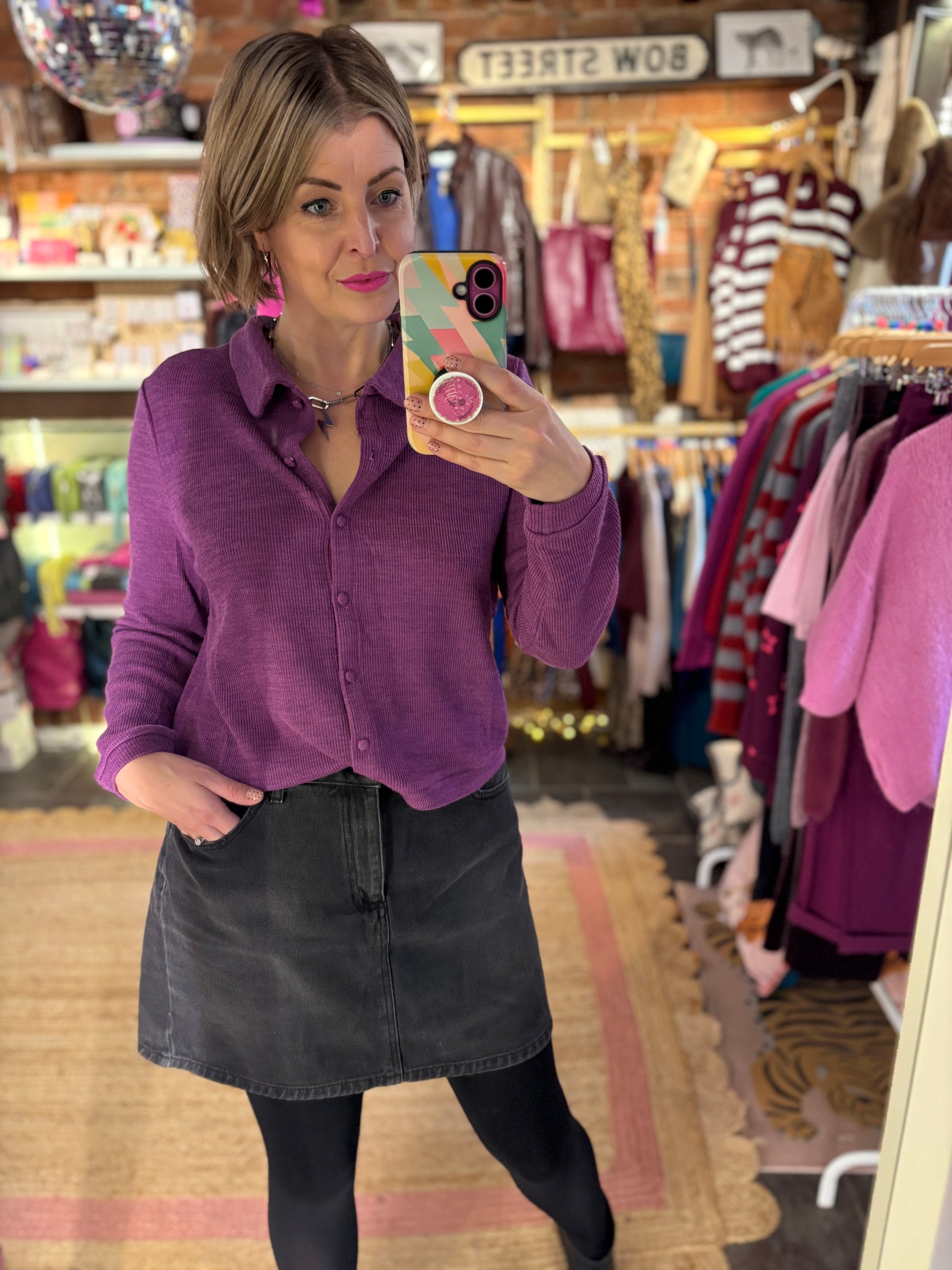 It features a striking magenta color that pairs perfectly with charcoal denim jeans or our ribbed wide leg trousers for a coordinated look.
