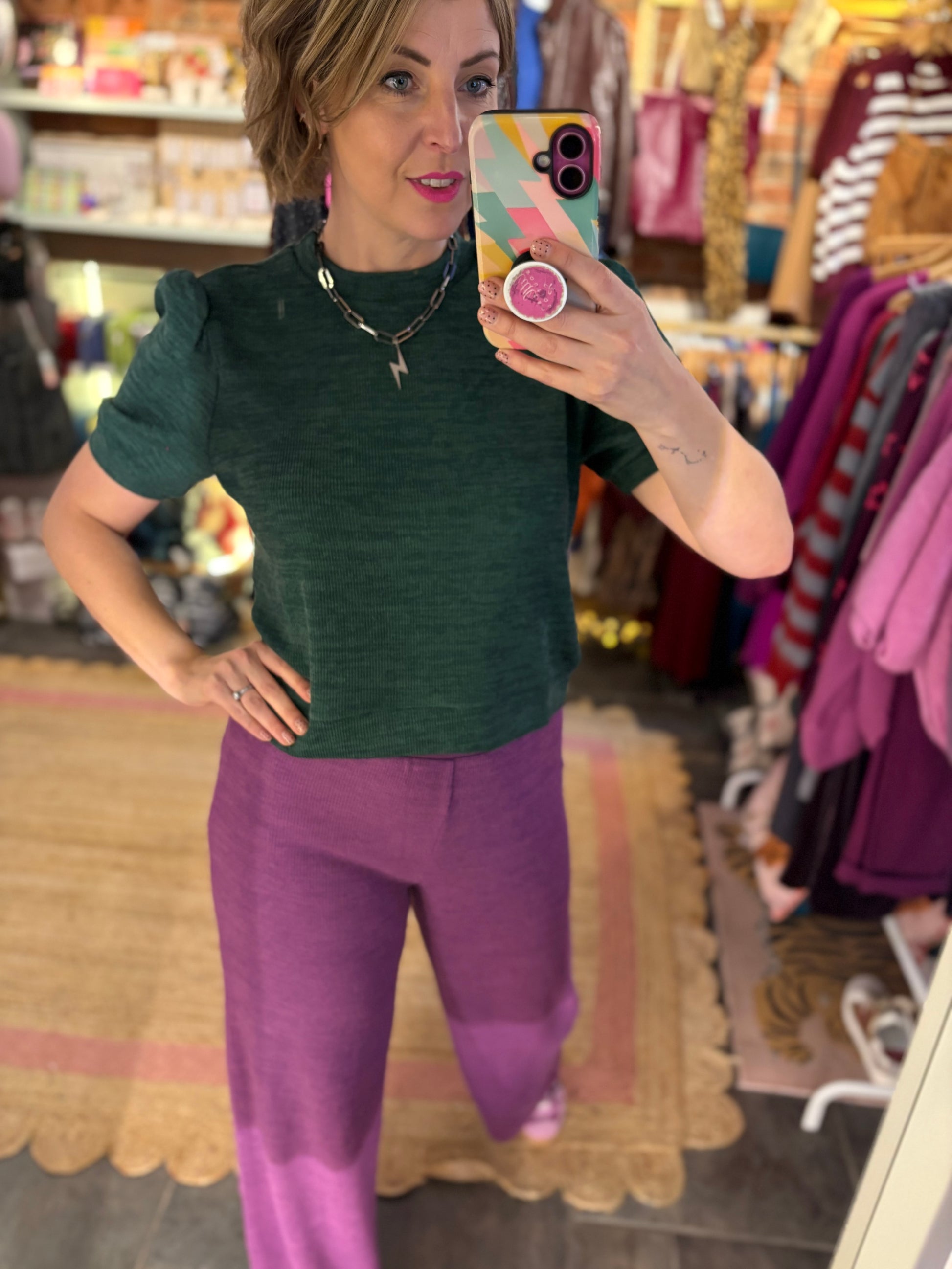 It features a versatile Forest Green color that pairs perfectly with a classic pair of jeans or our ribbed wide leg trousers for a coordinated look.