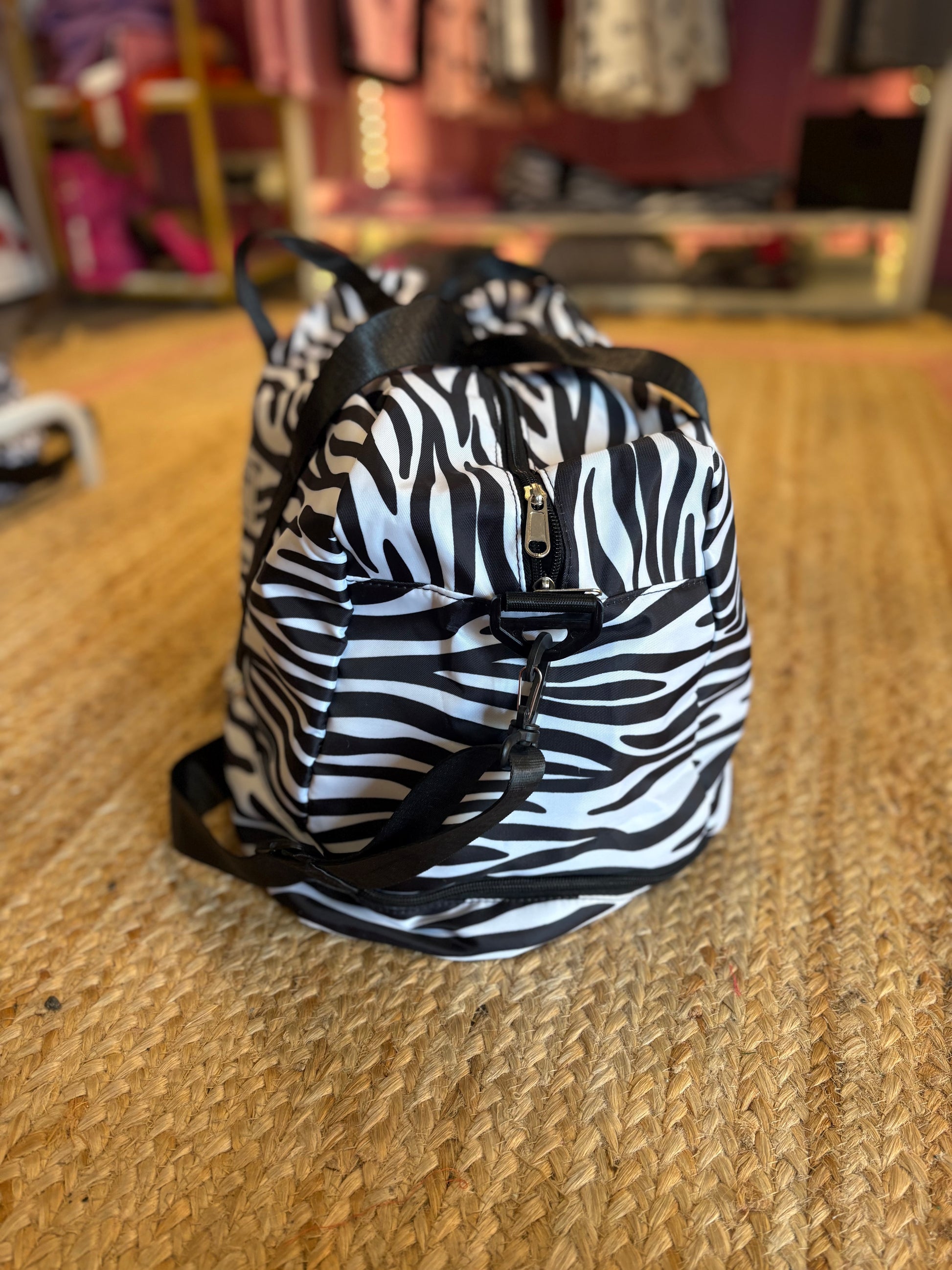 This lightweight holdall features a versatile black and white leopard or zebra print design that works with any outfit.