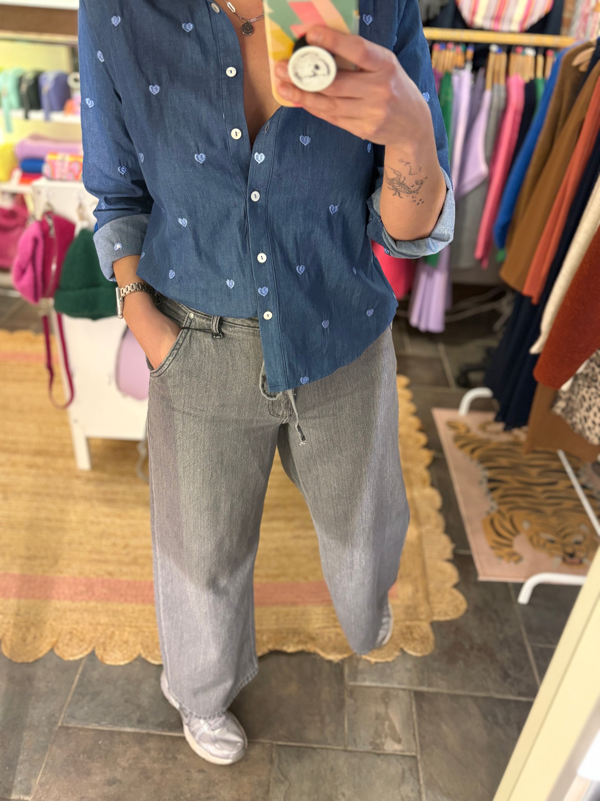 For a polished contemporary ensemble, coordinate with our cropped denim shirt jacket.